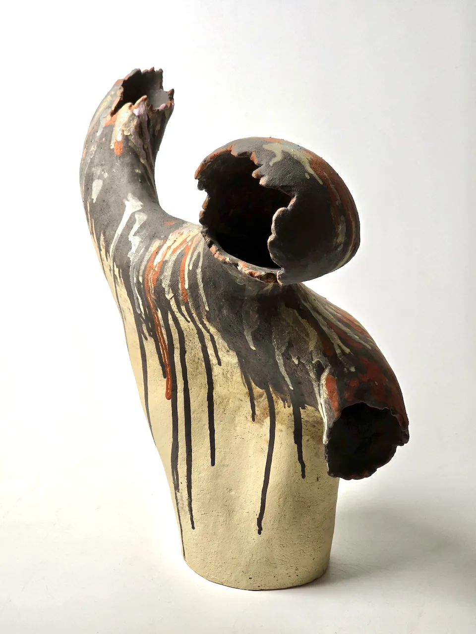 This large coiled sculpture was a finalist in Waiclay Ceramic Awards 2025. My inspiration was of a 'future relic' - 1000 years from now after a period of global warming where surviving trees were revered and even their fallen leaves collected and held sacred in a sealed container. This example has had that seal broken off and is in a form that represents the hot winds scouring the Earth.